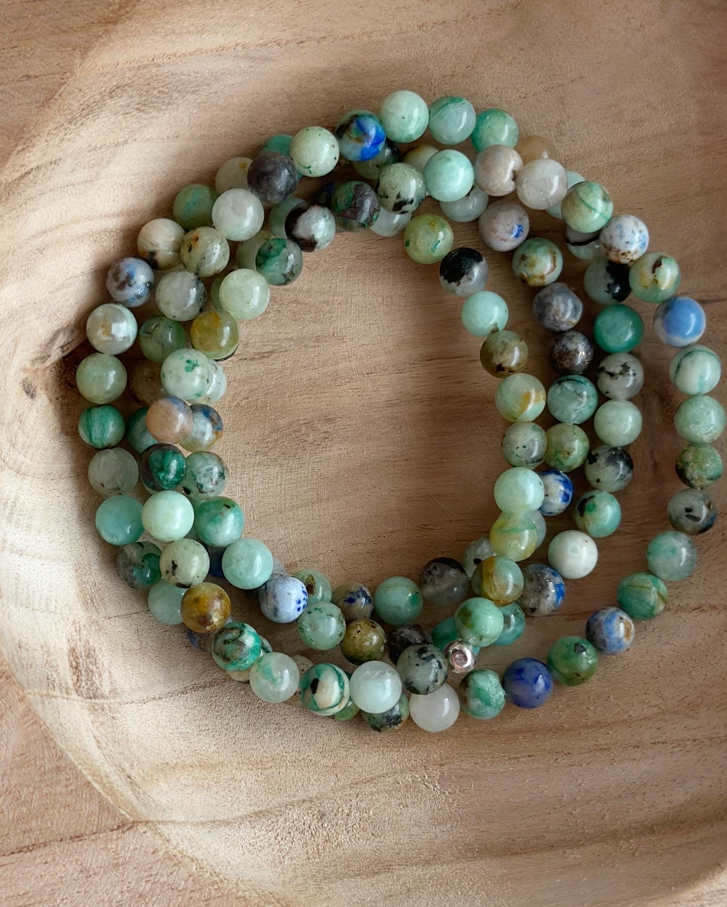 Naszyjnik wykonany został ręcznie z kamieni chryzokola.