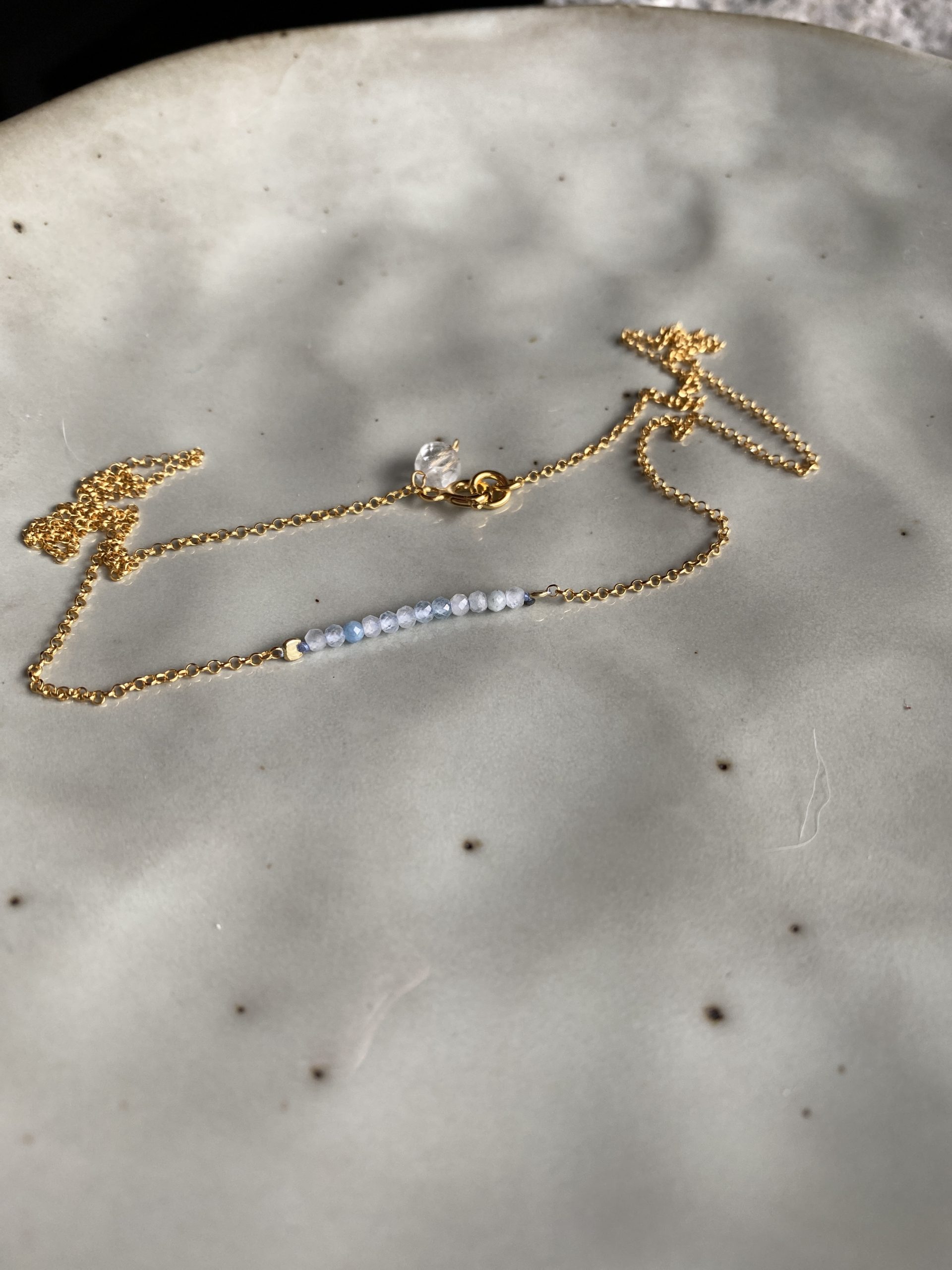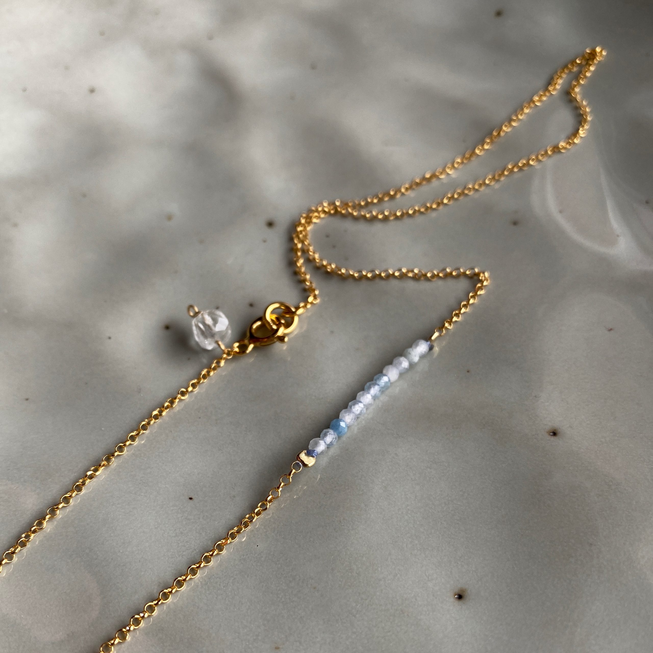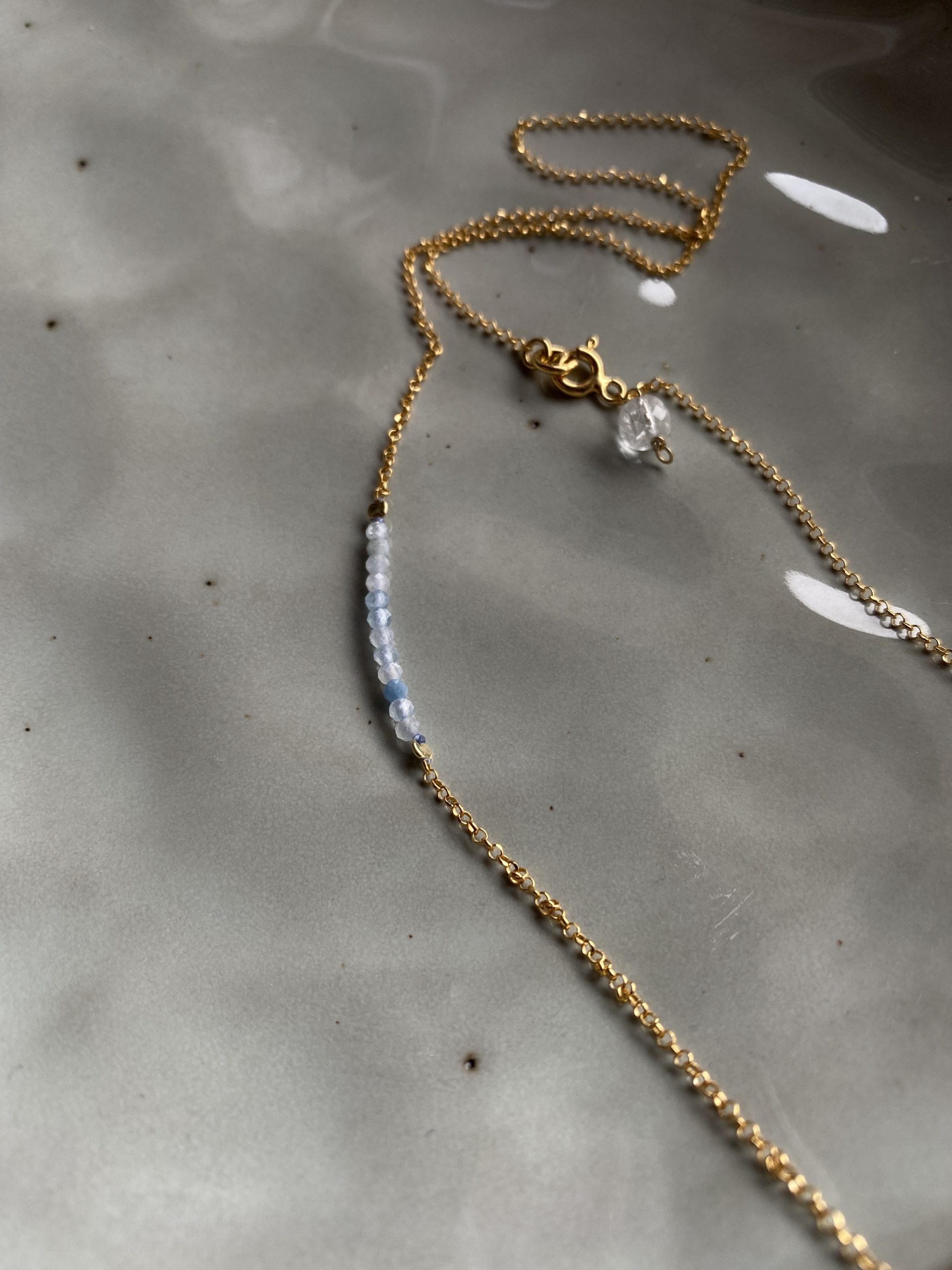 Subtelny naszyjnik wykonany z kamieni szlachetnych, akwamaryn i topaz.
